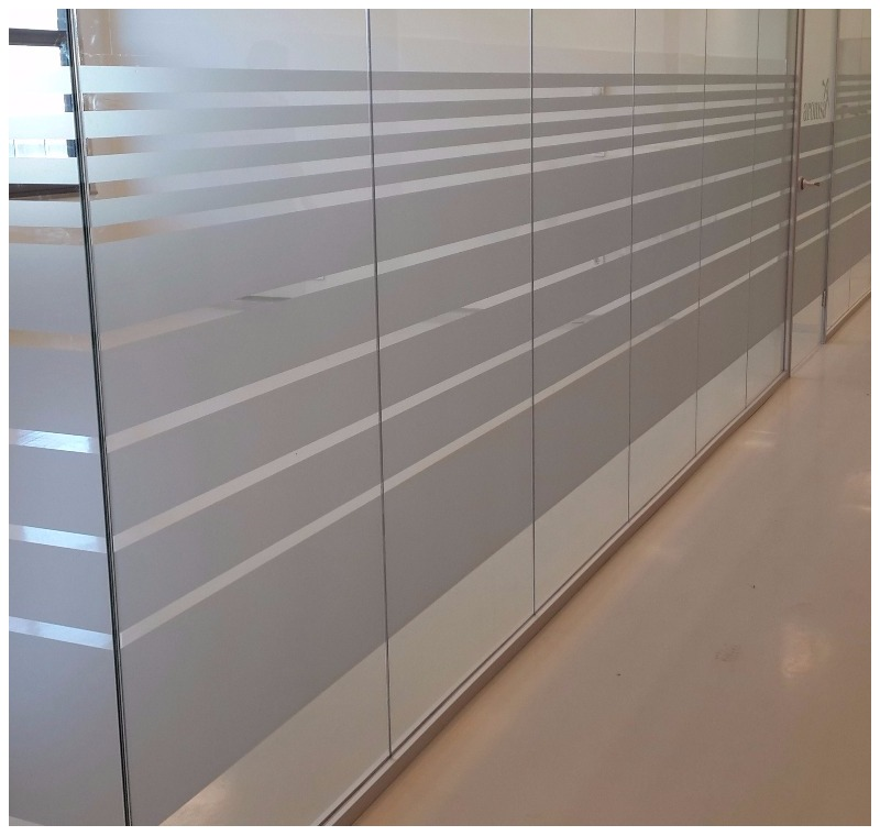 If you want to reduce sunlight entering your workplace, prevent the interior from being seen from the outside, and prevent glass from shattering if broken, you may need to apply frosted vinyl.